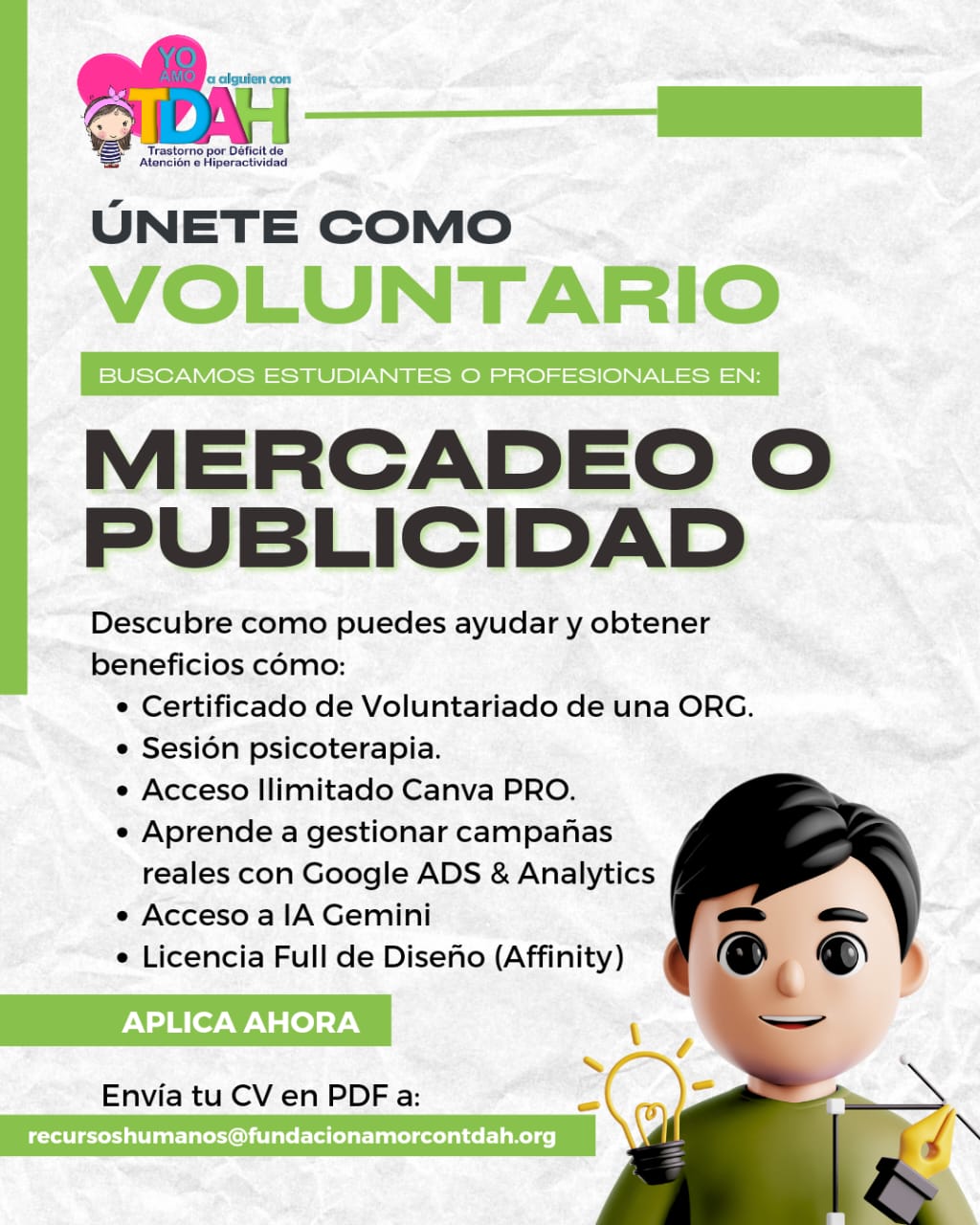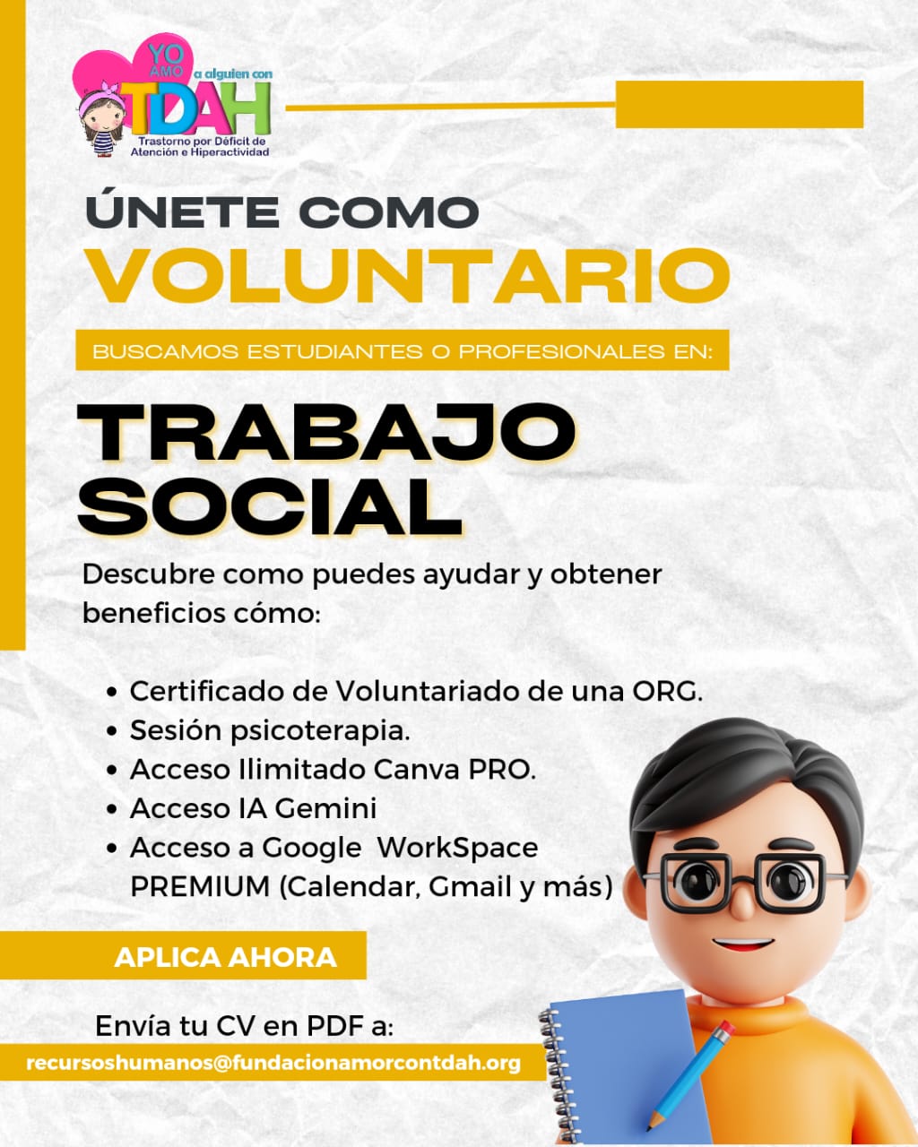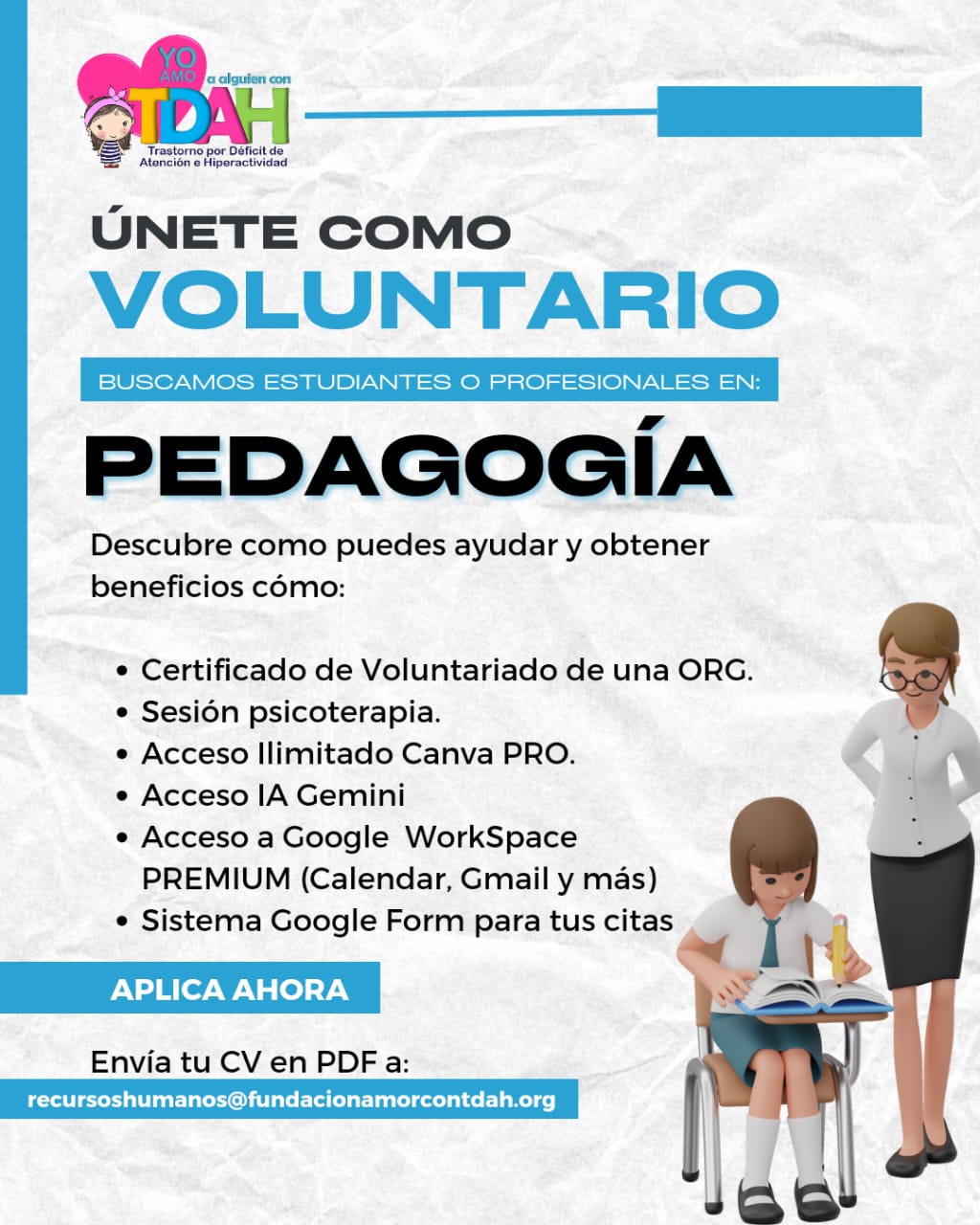 Voluntariado ¿Listo para inscribirte? Esperamos conocerte pronto. Abordamos el manejo conductual, desarrollo de habilidades sociales, y apoyo emocional para niños con TDAH y TEA. +57 316 5560267 amorcontdah amorcontdah Nuestros cargos de voluntariado 01 02 03 04 05 06 07 08